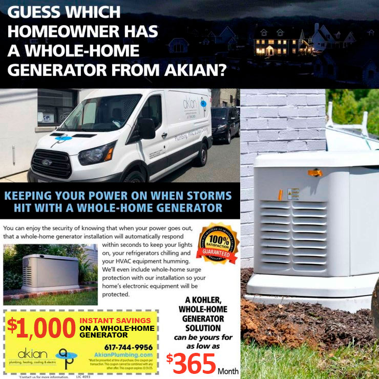 Power outages are unpredictable, but your home’s safety and comfort don’t have to be. Akian Plumbing, Heating, Cooling & Electric is making it easier than ever to protect your home with a Kohler whole-home generator.